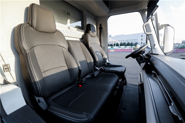 如果说三电系统决定了下限,那座舱配置可能决定价值上限。欧马可Z将MPV体验搬进了驾驶室,让枯燥货运变成一种享受。全球首创470mm的一级踏步设计的背后是对底盘架构的重新布局,是对卡友群体生存现状的深刻洞察;纯平地板、2米2站立高度、49°方向盘倾角、电子手刹、怀挡设计等MPV级座舱体验,这些以往只在乘用车上出现的配置成为了轻卡新配置,是企业人文关怀的进一步体现。